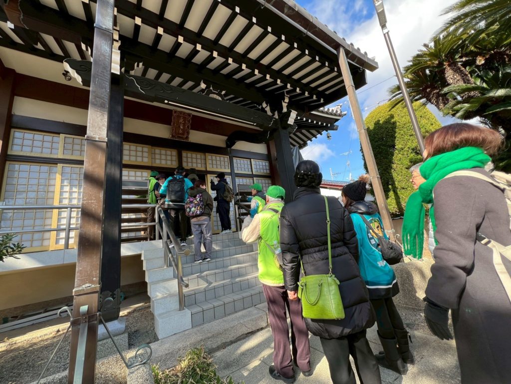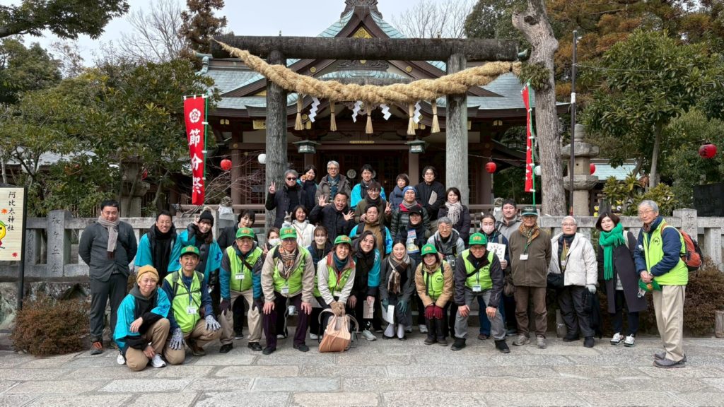 当日は雪が舞う今季一番の寒さとなりましたが、観光ボランティアガイドの皆さまのご協力のもと、箕面萱野駅を起点に、萱野三平記念館、教学寺、阪急桜井駅、阿比太神社など、西国街道を中心とした約8kmのコースを歩きました。